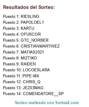 Lista de participantes: PIPE-MX 1, PAPOLOEL1 2, CHRIS_Q 3, MIZTIKO 4, COMENDATORE__SP 5, PELADIVER 6, RAIDEN 7, KARTU 8, JEZ03MAG 9, MATIAS2021 10, LOCOESLARA 11, OFUSCOR 12, RIESLING 13, GTC_NORBER 14, CRISTIANMARTINEZ 15.