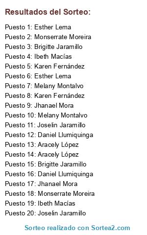 Lista de participantes: Karen Fernández, Karen Fernández, Brigitte Jaramillo, Brigitte Jaramillo, Joselin Jaramillo, Joselin Jaramillo, Esther Lema, Esther Lema, Daniel Llumiquinga, Daniel Llumiquinga, Aracely López, Aracely López, Ibeth Macías, Ibeth Macías, Melany Montalvo, Melany Montalvo, Jhanael Mora, Jhanael Mora, Monserrate Moreira, Monserrate Moreira.