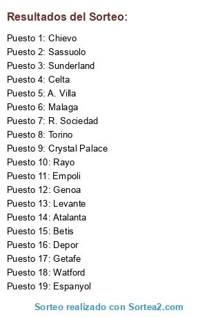 Lista de participantes: Atalanta, Chievo, Empoli, Genoa, Sassuolo, Torino, Betis, Rayo, Espanyol, Depor, R. Sociedad, Celta, Getafe, Levante, Malaga, A. Villa, Watford, Sunderland, Crystal Palace, inter, liverpool, bilbao, valencia, villareal, leicester, milan, tottenham, newcastle, west ham, napoles, everton, stoke city, sevilla, fiorentina, lazio, roma, swansea, southampton.