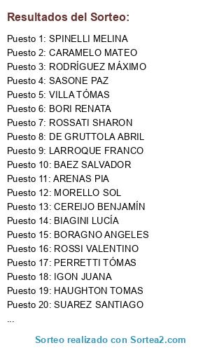 Lista de participantes: ARENAS PIA, BARRA AGUSTIN, BIAGINI LUCÍA, BORI RENATA, BOTTA NICÓLAS, CABACHIEFF KIARA, CABRERA MATEO, CIRILLO CANDELA, CONDE FACUNDO, GAUNA BENJAMÍN, GENOVECIO VICTORIA, GENTILE MÁXIMO, HAUGHTON TOMAS, MARENCO SOLANO, MENDIOLA ÁNDRES, MORELLO SOL, MORENO LORENZO, RICCA CHIARA, RICCI ANA, RODRÍGUEZ MÁXIMO, ROSA OCTAVIO, ROSSATI SHARON, SASONE PAZ, SILVA ASUNCIÓN, SPINELLI MELINA, SPINELLI TOMÁS, SUAREZ SANTIAGO, VELTANI VICTORIA, ZAMMITTO MATEO, ALONSO FACUNDO, ANGULO MATEO, BAEZ SALVADOR, BERMUDEZ CAMILA, BORAGNO ANGELES, CARAMELO MATEO, CECCO JUANA, CELAY CLARA, CEREIJO BENJAMÍN, CHANGAZO TOBIAS, COSTILLA YAZMÍN, DE GRUTTOLA ABRIL, DE GRUTTOLA NICÓLAS, DENÁPOLE ANA, ESPINDOLA FRANCISCO, ESTRELLA GIULIANA, FONTAINE AGUSTIN, HORN LUCIA, IGON JUANA, IVALDI MERLINA, LARROQUE FRANCO, LOCAMPO JOSEFINA, LOMBARDO MICAELA, MARCATI LUCA, MARCHESINI JULIA, MONES RUIZ IGNACIO, PAMPURI JOAQUÍN, PERRETTI TÓMAS, RÉVORA BELÉN, ROSALES MAÍA, ROSSI VALENTINO, SCARDULLA TATIANA, SCHULDEIS TATIANA, VILLA TÓMAS.