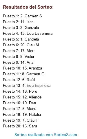 Lista de participantes: 1. Candela, 2. Carmen S, 3. Gonzalo, 4. Edu Espinosa, 5. Manu, 6. Raúl, 7. Clau F, 8. Carmen G, 9. Victor, 10. Dan, 11. Iker, 12. Allende, 13. Edu Estremera, 14. Ana, 15. Arantza, 16. Sara, 17. Mer, 18. Poru, 19. Natalia, 20. Clau M.