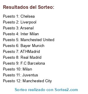 Lista de participantes: Milan, Manchested United, Manchested City, Real Madrid, F.C Barcelona, Liverpool, Arsenal, Chelsea, Juventus, ATHMadrid, Inter Milan, Bayer Munich.