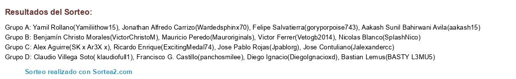 Lista de participantes: Aakash Sunil Bahirwani Avila(aakash15), Alex Aguirre(SK x Ar3X x), Bastian Lemus(BASTY L3MU5), Benjamín Christo Morales(VictorChristoM), Claudio Villega Soto( klaudiofull1), Diego Ignacio(DiegoIgnacioxd), Felipe Salvatierra(goryporpoise743), Francisco G. Castillo(panchosmilee), Jonathan Alfredo Carrizo(Wardedsphinx70), Jose Contuliano(Jalexandercc), Jose Pablo Rojas(Jpablorg), Mauricio Peredo(Mauroriginals), Nicolas Blanco(SplashNico), Ricardo Enrique(ExcitingMedal74), Victor Ferrer(Vetogb2014), Yamil Rollano(Yamiliithow15).