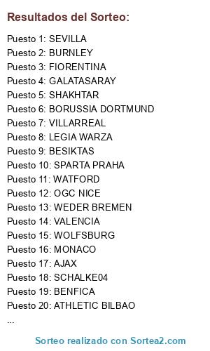 Lista de participantes: BENFICA, GALATASARAY, MARSEILLE, BARCELONA, SOUTHAMPTON, ZENIT, BESIKTAS, WOLFSBURG, BORUSSIA DORTMUND, LEGIA WARZA, OGC NICE, GRANADA, VILLARREAL, TORINO, MAN UNITED, FC PORTO, TOULOUSE, SPARTA PRAHA, WATFORD, PSV, OLYMPIACOS, SEVILLA, VALENCIA, AJAX, SCHALKE04, MONACO, ATHLETIC BILBAO, LAZIO, FIORENTINA, SHAKHTAR, BURNLEY, WEDER BREMEN.