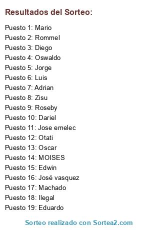 Lista de participantes: Otati, Luis, Jose emelec, Dariel, Oswaldo, Eduardo, MOISES, Oscar, Roseby, Edwin, Ilegal, Jorge, Adrian, Zisu, José vasquez, Rommel, Machado, Mario, Diego.