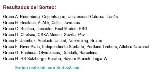 Lista de participantes: Chelsea, Barcelona, PSG, River Plate, Independiente Santa fe, Real Madrid, Sevilla, Leicester, Bayern Munich, Juventus, Al Ahli, Lanús, Adelaide United, RB Salzburgo, Brujas, Norrkoping, Universidad Catolica, Atletico Nacional, Jeonbuk, Copenhague, Celtic, Portland Timbers, Olympiacos, Dundalk, Pachuca, Rosenborg, Legia W., Benfica, CSKA Moscu, Besiktas, Psv, Basilea.