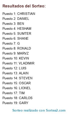 Lista de participantes: DANIEL, BEN, ALAIN, STEVEN, TIM, RONALD, GARY, G, CARLOS, SUMTER, LIONEL, CHRISTIAN, LUIS, SHANE, OSCAR, KEVIN, MARVZ, VLADIMIR, HESHAM.