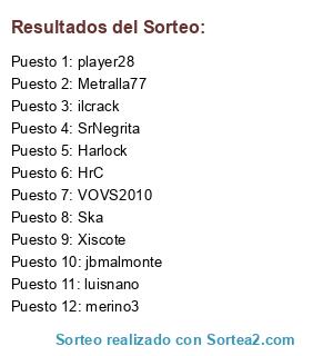 Lista de participantes: Xiscote, Harlock, VOVS2010, jbmalmonte, Ska, merino3, Metralla77, luisnano, player28, HrC, SrNegrita, ilcrack.