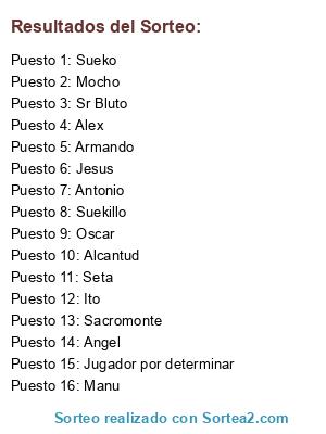 Lista de participantes: Alex, Antonio, Armando, Alcantud, Sr Bluto, Jesus, Oscar, Angel, Sacromonte, Seta, Sueko, Suekillo, Mocho, Ito, Manu, Jugador por determinar.