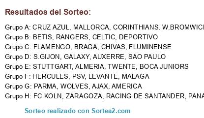 Lista de participantes: PARMA, STUTTGART, HERCULES, FLAMENGO, FLUMINENSE, PANATHINAIKOS, FC KOLN, SAO PAULO, CORINTHIANS, ALMERIA, ZARAGOZA, AMERICA, CHIVAS, MALAGA, MALLORCA, BETIS, AJAX, TWENTE, DEPORTIVO, RACING DE SANTANDER, WOLVES, GALAXY, W.BROMWICH, PSV, BRAGA, RANGERS, AUXERRE, CELTIC, S.GIJON, CRUZ AZUL, BOCA JUNIORS, LEVANTE.