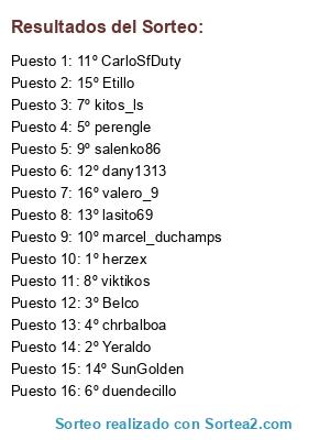 Lista de participantes: Tato, Tala, Alarik, Mosto, Danifuria, Ganja, Bios, gamero, fariza, Grayson, Garu, DBEleven, mangurrinomigue, xemyky, javiferrer, elGachoQueFalta.