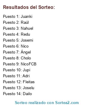 Lista de participantes: Josemi, Redu, Joselu, Jupi, Juanki, Dailo, Adri, Fleitas, Raúl, Cholo, Nico, Nahuel, NicoFCB, Ángel.