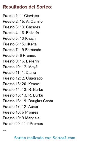 Lista de participantes: 1. Giovinco, 2. Berg, 3. Ninis, 4. Diarra, 5. Zeca, 6. Nano, 7. Sánchez, 8. Wemmer, 9. Steele, 10. Vela, 11. Danilo Pereira, 12. Klonaridis, 13. Schurrle, 14. Suchy, 15. Diouf, 16. Bellerín, 17. Marquinhos, 18. Joaozinho, 19. Valdés, 20. Keane, 1. Günok, 2. Bernat, 3. Advincula, 4. Aziz, 5. Sivok, 6. Pereyra, 7. Dzsudzsak, 8. Josue, 9. Martial, 10. Stoch, 11. Dybala, 12. Uche, 13. R. Burku, 14. Enzo Perez, 15. A. Carrillo, 16. Necid, 17. Tesdemir, 18. P. Oliveira, 19. Smolnikov, 20. Vertonghen, 1 Gicnac, 2 Sobis, 3 Braithwaite, 4 Juninho, 5 Konoplyanka, 6 Promes, 7 Aquino, 8 Torres, 9 Mangala, 10 Khazri, 11 Palos, 12 González, 13 Filipe Luis, 14 Umiti, 15 Clyne, 16 Pizarro, 17 Guzmán, 18Torres Nilo, 19 Elm, 20 Remy, 21 Mahrez, 1 Azpilicueta, 2 Costil, 3 Dzyuba, 4 Danilo, 5 B. Peres, 6 Mirallas, 7 florenzi, 8 Subotic, 9 rode, 10 Gradel, 11 Amrabat, 12 Lulic, 13 Distin, 14 Atsu, 15 Boruc, 16 Wilson, 17 Cook, 18 Daniels, 19 King, 1. Javi Varas, 2. David simon, 3. Aythami, 4. Garrido, 5. Auba, 6. El Zhar, 7. Viera, 8. Araujo, 9. Ben yedder, 10. Dembele, 11. Mertens, 12. Moyá, 13. Wakaso, 14. Fernandinho, 15. Griezman, 16 Chedjou, 17.Radu, 1. Enyeama, 2. Maggio, 3. Willems, 4. Nkoulou, 5. Schar, 6. Onuoha, 7. Morata, 8. Junuzovic, 9. Kane, 10. Volland, 11. Ntep, 12. Yun Suk, 13. Green, 14. Austin, 15. Faurlin, 16. Fer, 17. Hoillet, 18. Krychowiak, 19. Piszczek, 20. Phillips, 1 Berardi, 2 Consigli, 3 Sansone, 4 Defrel, 5 Acerbi, 6 Cannavaro, 7 Vrsaljko, 8 Floccari, 9 Pegolo, 10 Ariaudo, 11 Bony, 12 Sturridge, 13 Peluso, 14 Antei, 15 Magnanelli, 16 Terranova, 17 Naingolan, 18 Deulofeu, 19 Fernando, 20 Parolo, 21 Juanfran, 22 Manolas, 23 Gaya, 1. Lecomte, 2. Cuadrado, 3. Lautoa, 4. Koné, 5. Le Goff, 6. Mesloub, 7. Kanté, 8. Moukandjo, 9. Guerreiro, 10. Waris, 11. Germain, 12. Chaigneau, 13. Cáceres, 14. De Marcos, 15. Ndong, 16. Lacazette, 17. Asamoah, 18. Trémoulinas, 19. Douglas Costa, 20. Eriksen, 1- Hassen, 2- Walker, 3- Pereira, 4- Le Marchand, 5- Bodmer, 6- Mendy, 7- Jese, 8- Alex Sandro, 9- Ben Arfa, 10- Pléa, 11- Zouma, 12- Aurier, 13- Witsel, 14- Zieler, 15- Stones, 16- Willian, 17- Pato, 18- Seri, 19- Son, 1. Weidenfeller, 2. Aleix Vidal, 3. Bartra, 4. Bailly, 5. Baba, 6. Gerrard, 7. Guardado, 8. Gio, 9. Giuliano, 10. Mané, 11. Promes, 12. Ricketts, 13. Xhaka, 14. González, 15. Keita, 16. Zardes, 17. Buddle, 18. Maganto, 19. Rowe, 20. Gargant, 21. Dunivant, 22. Gordon, 01 Saunders, 02 Angelino, 03 Mena, 04 Iraola, 05 Poku, 06 Lampard, 07 Pirlo, 08 David Villa, 09 Mastour, 10 Rico Henry, 11 Ouali, 12 Diskerud, 13 Shaqiri, 14 Íñigo Martínez, 15 Oblak, 16 Doumbia, 17 Thiago, 18 Varane, 19 Carvajal, 20 Ricardo Rodríguez.