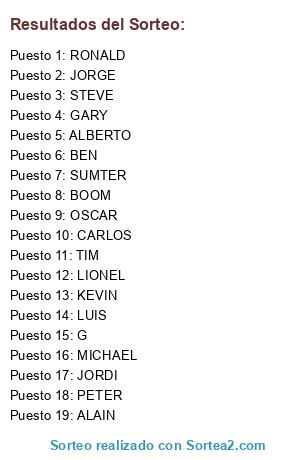 Lista de participantes: ALAIN, PETER, JORDI, RONALD, G, KEVIN, CARLOS, LUIS, JORGE, TIM, ALBERTO, MICHAEL, BEN, STEVE, BOOM, LIONEL, OSCAR, SUMTER, GARY.