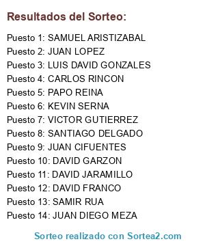 Lista de participantes: DAVID GARZON , DAVID FRANCO , JUAN LOPEZ, JUAN DIEGO MEZA, KEVIN SERNA, DAVID JARAMILLO, CARLOS RINCON, PAPO REINA, VICTOR GUTIERREZ, SANTIAGO DELGADO, SAMIR RUA, SAMUEL ARISTIZABAL, LUIS DAVID GONZALES, JUAN CIFUENTES.