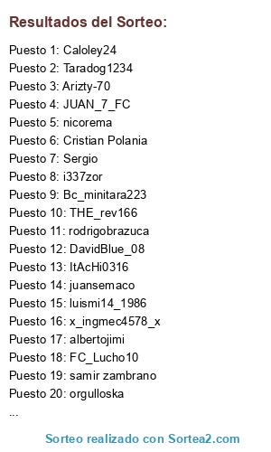 Lista de participantes: nicorema, juansemaco, sebaso11ce, DavidBlue_08, samir zambrano, Lion-o89, FC_Lucho10, Taradog1234, Yugcer, juangars1948, AndresGomL, JONS_TOON, nathan_0223, bernii13, Shaka, Ger, alejo_86, checho881226, Dyusti, alexanderyusti, CAOLIVEROS, VanHomero, Jey, p_etroska, blut_schwarz, colombianito85, SERAM1219, john3241, THE_rev166, ColomboParaguayo, ItAcHi0316, CESAR10N-USA, Iarebaboon, JOa-_-, JUAN_7_FC, rodrigobrazuca, sharkpaisa1, albertojimi, fifaramos1, JD_Thekiller, JORGEEGV, luismi14_1986, VlachoP2, bhhjkl, sherederc, CamiloGunner13, x_ingmec4578_x, diablonan, Castor, Bc_minitara223, Arizty-70, i337zor, fabianlarita3, Caloley24, ezequiel_panay82, yuyimo, Cruel21, orgulloska, esteban_casper, upperleinad, Sergio, Cristian Polania, decolombiajaja, turry2011.
