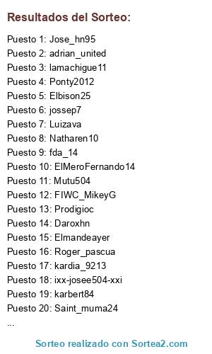 Lista de participantes: acxelchifu_patas, J_Masca17, hatakeczarito, balin2525, lanza2501, jasonop7, Carash082016, Dfwerrwer12, cheleman17, Jonathan-hond, csalinashn, Elmandeayer, Oseguera29, Luizava, brayan_10real, Miguelbass1, elmiso7, Ruzzi06, zurdo614, pollogool-, gejacodi97, KingAdrian956, fadar9709, Mutu504, Daroxhn, Ponty2012, gogoguerrero, medar_r16, adrian_united, Jose_hn95, malv2092, FofoGR8, JesseTrejo10, Natharen10, Elbison25, Prodigioc, Emohall23, davidlpz10_hn, Alvaradohn, smith123456578, jossep7, msosaf0406, Saint_muma24, FIWC_MikeyG, karbert84, lamachigue11, Muma10_elflak0o, ixx-josee504-xxi, mauriciovargas7, kardia_9213, Deasis, RafaelV2525, EdRey9090, fda_14, Roger_pascua, leo_pineda, Vaurquia09, MvP_Coroso-Co-, Soto04-27-1993, ElMeroFernando14.