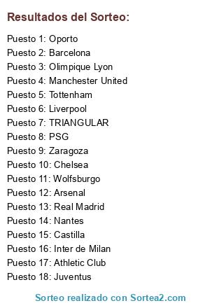 Lista de participantes: Nantes, Oporto, Manchester United, Athletic Club, Inter de Milan, Zaragoza, Tottenham, PSG, Olimpique Lyon, Real Madrid, Wolfsburgo, Arsenal, Barcelona, Liverpool, Juventus, Chelsea, Castilla, TRIANGULAR.