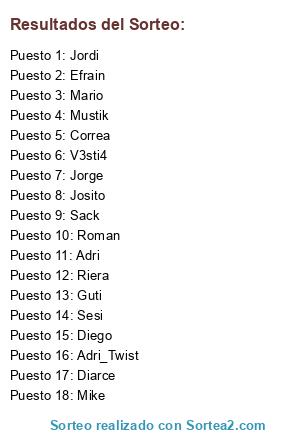 Lista de participantes: Adri, Roman, Guti, Jordi, Mario, Sack, Jorge, Mustik, Riera, Diego, V3sti4, Adri_Twist, Correa, Diarce, Efrain, Sesi, Mike, Josito.