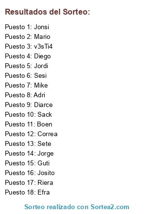 Lista de participantes: Guti, Jorge, Efra, Jonsi, Josito, Sete, Sack, Diego, Diarce, Correa, Boen, Mario, Adri, Riera, Mike, v3sTi4, Jordi, Sesi.