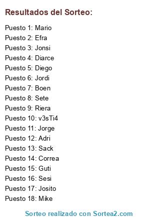 Lista de participantes: Guti, Jorge, Efra, Jonsi, Josito, Sete, Sack, Diego, Diarce, Correa, Boen, Mario, Adri, Riera, Mike, v3sTi4, Jordi, Sesi.