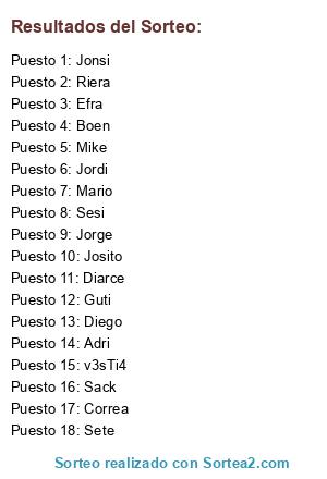 Lista de participantes: Guti, Jorge, Efra, Jonsi, Josito, Sete, Sack, Diego, Diarce, Correa, Boen, Mario, Adri, Riera, Mike, v3sTi4, Jordi, Sesi.