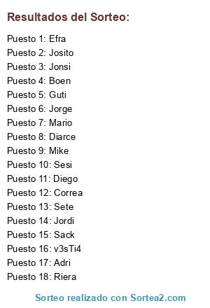 Lista de participantes: Guti, Jorge, Efra, Jonsi, Josito, Sete, Sack, Diego, Diarce, Correa, Boen, Mario, Adri, Riera, Mike, v3sTi4, Jordi, Sesi.