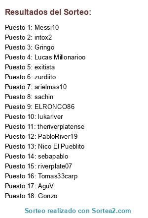 Lista de participantes: Gringo, sebapablo, Gonzo, PabloRiver19, zurdiito, lukariver, exitista, Lucas Millonarioo, AguV, ELRONCO86, arielmas10, sachin, riverplate07, Nico El Pueblito, Messi10, Tomas33carp, intox2, theriverplatense.