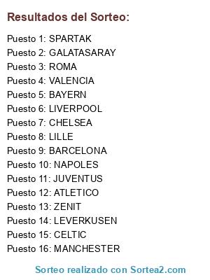 Lista de participantes: GALATASARAY, ROMA, BARCELONA, ATLETICO, CHELSEA, LEVERKUSEN, VALENCIA, CELTIC, LILLE, SPARTAK, NAPOLES, ZENIT, BAYERN, JUVENTUS, MANCHESTER, LIVERPOOL.