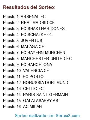 Lista de participantes: FC BARCELONA, REAL MADRID CF, JUVENTUS, GALATASARAY AS, FC SCHALKE 04, CELTIC FC, ARSENAL FC, FC BAYERN MUNCHEN, FC SHAKTHAR DONEST, BORUSSIA DORTMUND, AC MILAN, MANCHESTER UNITED FC, VALENCIA CF, PARIS SAINT-GERMAIN, FC PORTO, MALAGA CF.