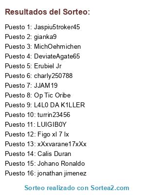 Lista de participantes: Calis Duran, Johano Ronaldo, charly250788, Erubiel Jr, L4L0 DA K1LLER, gianka9, JJAM19, LUIGIB0Y, turrin23456, Op Tic Oribe, Figo xl 7 lx, Jaspiu5troker45, jonathan jimenez, MichOehmichen, xXxvarane17xXx, DeviateAgate65.