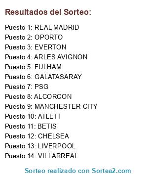 Lista de participantes: BETIS, PSG, LIVERPOOL, VILLARREAL, GALATASARAY, ARLES AVIGNON, REAL MADRID, ATLETI, ALCORCON, EVERTON, MANCHESTER CITY, CHELSEA, OPORTO, FULHAM.