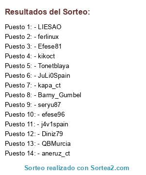 Lista de participantes: - JuLi0Spain, - Tonetblaya, - LIESAO, - seryu87, - j4v1spain, - kapa_ct, - Diniz79, - efese96, - QBMurcia, - Barny_Gumbel, - aneruz_ct, - ferlinux, - Efese81, - kikoct.