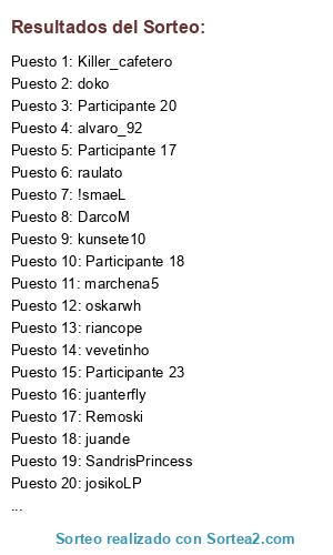 Lista de participantes: juande, !smaeL, juanterfly, riancope, oskarwh, kunsete10, raulato, Killer_cafetero, marchena5, doko, alvaro_92, SandrisPrincess, Remoski, DarcoM, josikoLP, vevetinho, Participante 17, Participante 18, Participante 19, Participante 20, Participante 21, Participante 22, Participante 23, Participante 24.