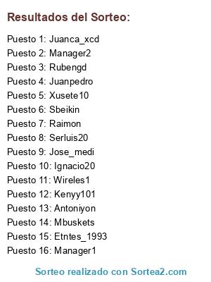 Lista de participantes: Serluis20, Rubengd, Raimon, Jose_medi, Antoniyon, Juanca_xcd, Juanpedro, Xusete10, Ignacio20, Sbeikin, Mbuskets, Etntes_1993, Wireles1, Kenyy101, Manager1, Manager2.