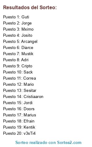 Lista de participantes: Kentik, Adri, Mustik, Guti, Diarce, Mximo, Jorge, Jordi, Correa, Cripto, v3sTi4, Mario, Sack, Arcangel, Sesitar, Doors, Josito, Cristiaaron, Efrain, Marius.