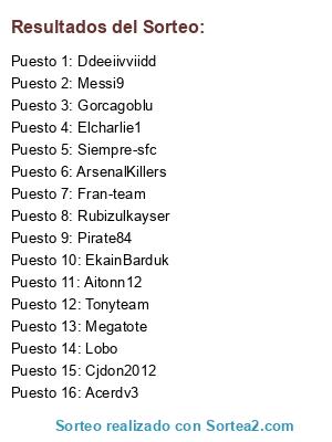 Lista de participantes: ArsenalKillers, Fran-team, Pirate84, Tonyteam, Cjdon2012, Elcharlie1, Aitonn12, Lobo, Rubizulkayser, Ddeeiivviidd, Acerdv3, EkainBarduk, Messi9, Megatote, Siempre-sfc, Gorcagoblu.