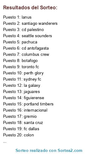 Lista de participantes: kaizer chiefs , orlando pirates , olympiakos , panathinaikos , PAOK , Shaktar , Brisbane roar , melboourne victory , sydney fc , perth glory , al hilal , al alhi , al nassr , al ittihad , jeonbuk , bluewings , jeju united , sangju sangmu fc , kashima antlers , urawa red diamonds , kashiwa reysol , vissel kobe , toronto fc , seattle sounders , columbus crew , orlando city , portland timbers , vancouver whitecaps , la galaxy , sporting kansas city , fc dallas , chicago fire , san jose earthquakes , new york red bulls , tigres UANL , monterrey , america , guadalajara , deportivo toluca , pachuca , santos laguna , tijuana , club atlas , monarcas morelia , atletico nacional , junior fc , deportivo cali , independiente santa fe , millonarios , D.I.M. , once caldas , deportes tolima , aguilas , la equidada , atletico buramanga , jaguares , u catolica , colo-colo , u de chile , cd ohiggins , u de concepcion , u española , cd antofagasta , deportes iquique , cd palestino , santiago wanderers , audax italiano , cd huachipato , palmeiras , internacional , atletico paranaense , gremio , america fc , fluminense , botafogo , santa cruz , ponte preta , figuierense , santos , san pablo , san lorenzo , river plate , independiente , racing , lanus , rosario central , estudiantes , colon , huracan , godoy cruz , gimnasia , .