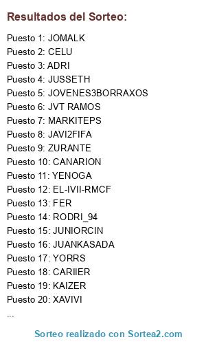 Lista de participantes: GION 22, PARLIKE, ZURANTE, ALEXAE_10, ALEX-GRANIANO, AOS26, YORRS, JOVENES3BORRAXOS, ROANC, XAVIVI, CANARION, JOMALK, KAIZER, FER, JAVI2FIFA, MARKITEPS, IVANFM_32, RAUL_GT, MIGUEL_RSG, CELU, JUANJOPC, ADRI, VERTOVV11, ALIMINOX, JVT RAMOS, JUANKASADA, JUNIORCIN, CARIIER, RODRI_94, EL-IVII-RMCF, CACERENCIHNO, JUSSETH, JOTA_COMUNIO, YENOGA.