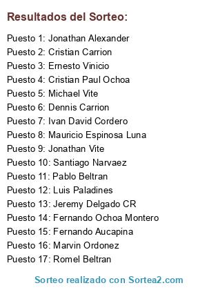 Lista de participantes: Ivan David Cordero, Marvin Ordonez, Cristian Carrion, Dennis Carrion, Fernando Ochoa Montero, Mauricio Espinosa Luna, Jeremy Delgado CR, Jonathan Alexander, Jonathan Vite, Michael Vite, Cristian Paul Ochoa, Santiago Narvaez, Romel Beltran, Luis Paladines, Ernesto Vinicio, Fernando Aucapina, Pablo Beltran.