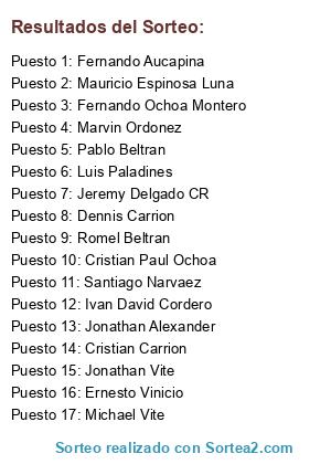 Lista de participantes: Ivan David Cordero, Marvin Ordonez, Cristian Carrion, Dennis Carrion, Fernando Ochoa Montero, Mauricio Espinosa Luna, Jeremy Delgado CR, Jonathan Alexander, Jonathan Vite, Michael Vite, Cristian Paul Ochoa, Santiago Narvaez, Romel Beltran, Luis Paladines, Ernesto Vinicio, Fernando Aucapina, Pablo Beltran.