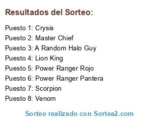 Lista de participantes: Scorpion, Master Chief, Crysis, Venom, Power Ranger Rojo, Power Ranger Pantera, A Random Halo Guy, Lion King.