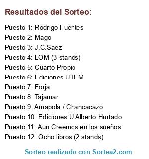 Lista de participantes: Aun Creemos en los sueños, Cuarto Propio, Ediciones U Alberto Hurtado, Ediciones UTEM, Forja, J.C.Saez, LOM (3 stands), Mago, Ocho libros (2 stands), Rodrigo Fuentes, Tajamar, Amapola / Chancacazo.