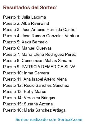 Lista de participantes: Silvia Garrote, Tamara GM, Rocio Franco, Señora Mundo Garcia, Sergio Crespo Pérez, Joaquin Soriano Garcia, Rocio Sanchez Sanchez, Maria DelCarmen Rodríguez Gracia, Tito Jaspe, Almudena Viedma Rodríguez, Joaquin Roldan, Susana Parreño, Remedios Garcia Chamizo, Fernando Roldán Rodríguez, Miriam Sánchez Muñoz, Davinia Barrios Garcia, Miner Clapes, Flor Lis, Ruth, Mariló Salmerón Fernández, WenDa Gil, Sonia Lunar Rivas, Miguel A Aroca, Cristina Valverde Muñoz, Minerva Serrano Esclapés, Mariajosé Moyano, Luz Divina Vega Luján, Erika Montes Pérez, LAURA TAUSTE GUTIERREZ, Montse Roig, Lorena Gallardo Martinez, Marina Aguerri, Mari Carmen Rodríguez, Pinturas Soriano Garcia, Sonia Torres Coca, Julia Lacoma, Paqui Ruiz Ales, Enrique Ros, Inma Cervera, Astrid Alonso Fernandez, Rocio Garcia escudero, Maty Arma, Rosa Clemente, Cristina Atienza, Amaia Torres Sánchez, Concepcion Matias Simarro, Rafael Perujo Melgar, Beatriz Marcos, Vanessa Fernandez, Isabel Fernández, Agustin Aguerri, Susana Azcona, Paola Perujo Melgar, Basilio Fernández, Manuela Moreno, Rocio Salas Rodríguez, Rafael Sierra Sanchez, Begoña Jimenez Barrul, Silvestre Benavente Martinez, Katy Martinez Hernandez, Juan Eduardo Benavente Martinez, Silvestre Benavente Macanas, Cristina Robaina lopez, Celestino Celes Menendez Medina, Antonia Corbacho, David FS, Jose Antonio Hermida Castro, Ester Muñoz, Maria Luisa Marian Medina Merchan, Pilar Carmona García, María Elena Rodriguez Perez, Cruz Nieto, Mari Trini Ruiz Requena, Tere SA, Pablo Blanco González, Vicent Benavent Martínez, Gema Garcia Ojeda, Marta Budiño Varela, Irene Segon Atis, Francisco Javier Espin, Jose Antonio Herrero Encinas, Laura Lopezosa Gonzalez, Manuel Cuervas, Maryjose Ds Matos, Raquel Sevilleja, Paula Mazariegos Mateos, Lidia Aguilar G, keila mengual gimenez, Neus Vallés, Silvia Hurtado Gisbert, Antonio Nieto de Liaño, Marta Reyes Rández, Alicia Olivares rosillo, Maika Flor, Veronica Frutos da Silva, Merce Rios, Pilar Gil Costa, Irene A Glez, Susana Belzuz Pascual, Nuri Antón Bravo, J Reinita Reinita, Delfín Iglesias Navarro, Ana Navas, Vanesa Alba Lopez, Nuria Iglesias Martin, Roberto Filloy Muñoz, Maria Jose, Leticia Calvo Pardilla, Manuel Caballero Borrego, Elisa Isabel Manzanares Artes, María José Manzanares Artés, David Gimeno Ramirez, Virginia Acevedo, Mariangeles Sales Perales, Nesg Yo Mismo (Nestor Grande Grande), PATRICIA DEMEDICE SILVA, Anna GP, Maria Jesus Camara Montelio, Esther Muñoz Martín, Maria Jose Gonzalez Roncero, Ana Isabel Artero Mena, Betty Marco, Begoña Diaz Ramirez, Jaime A González, Alba Riverwind, Luisa Menargues, Soledad Gomariz Rubira, Rocio Escalante Rodriguez, Jose Antonio Mestre Gomes, Jose Ramon Gonzalez Ventura, Maria Sanchez Artiaga, Ana Polo en facebook. Nombre real Ana Sampietro Quilez, Xaxu Bermejo, Cristina Crs, Noelya de la Paz, Celia Ruiz Barragán, Virgi Villar, Elena Serrano Muñoz, Lluisa Morales, Amparo Caballero, guillermo jose manzanares navarro, Ana Bermudez Pelaez, Ada Luna Fullana, Cristina Escribano Gutierrez, Jose Manuel Navarro Garcia, Juan Carballal, Sonia Folgueira Teijeiro, Gemma Bassets, Cintia Laredo Exposito, Irene Masip Morte, Francisco González Fernández, Andrés Villalón Rodríguez, Ascension Villa Alises, Pilar Castillo Porras, Miren Nekane Tokero Hernandez, Carmen Peral Toscano, Nuria Iglesias, Alba Ramos Gonzalo, Montse Moreno silgado, Pilar Pili, Nagore Grijalba, Asier López de Munain, Veronica Bringas, Yolanda Gonzalez, Alejandra Ramírez, Jose A. Bayon, Sylvia Gonzalez Peña.