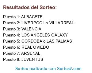 Lista de participantes: VALENCIA, JUVENTUS, CORDOBA o LAS PALMAS, LIVERPOOL o VILLARREAL, ALBACETE, REAL OVIEDO, ARSENAL, LOS ANGELES GALAXY.