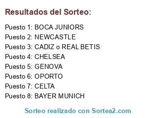 Lista de participantes: GENOVA, OPORTO, NEWCASTLE, CADIZ o REAL BETIS, BOCA JUNIORS, BAYER MUNICH, CHELSEA, CELTA.