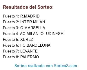 Lista de participantes: O.MARSELLA, AC.MILAN O UDINESE, INTER MILAN, R.MADRID, LEVANTE, FC.BARCELONA, XEREZ, PALERMO.