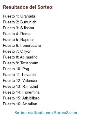 Lista de participantes: Fenerbache, Atl.madrid, Tottenham, Napoles, B.munich, S.lisboa, Psg, Levante, O.lyon, Roma, R.madrid, Valencia, Granada, Ath.bilbao, Ac.milan, Fiorentina.