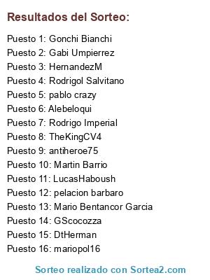 Lista de participantes: Alebeloqui, Gabi Umpierrez, Rodrigol Salvitano, Rodrigo Imperial, HernandezM, DtHerman, LucasHaboush, GScocozza, Mario Bentancor Garcia, TheKingCV4, Gonchi Bianchi, Martin Barrio, mariopol16, pelacion barbaro, pablo crazy, antiheroe75.
