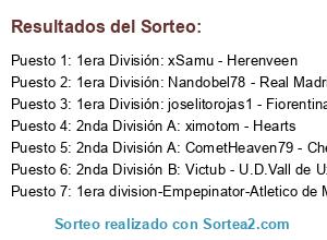 Lista de participantes: 1era division-Empepinator-Atletico de Madrid, 2nda División B: Victub - U.D.Vall de Uxó, 2nda División A: CometHeaven79 - Chelsea FC, 1era División: joselitorojas1 - Fiorentina, 1era División: Nandobel78 - Real Madrid, 2nda División A: ximotom - Hearts, 1era División: xSamu - Herenveen.